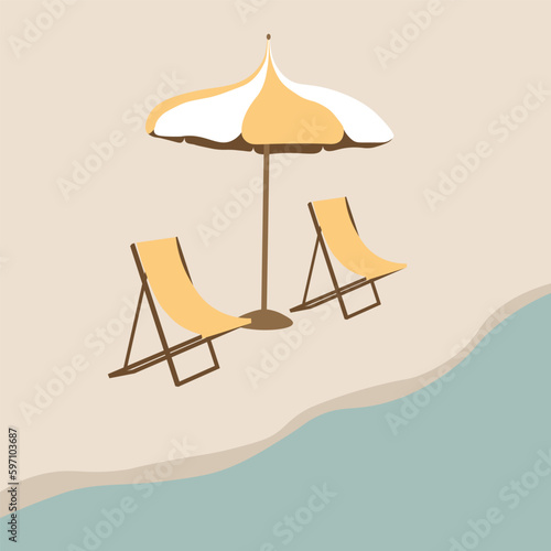 Beach. Illustration of resort sun loungers, umbrellas and coastline with water. Background template without people with sea, ocean, lake. Sunny weather and calm water. Cartoon vector illustration