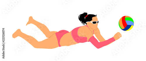 Beach lady volleyball player vector illustration isolated on white background. Volleyball girl in action. Summer time enjoying on sand. Woman sport activity. Active life style. Health care outdoor.