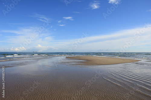 Beach near lighthouse, Skagen Grå Fyr, Denmark. North Sea Coast.