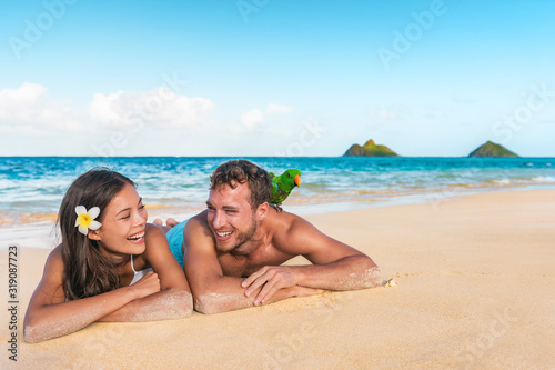 Beach people Hawaii honeymoon young couple laughing tourists with bird pet on shoulder - tourist attraction, Lanikai, Oahu island, USA travel.