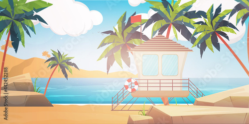 Beach rescue post. Beach, palm trees, lifebuoy. Cartoon style, vector illustration.