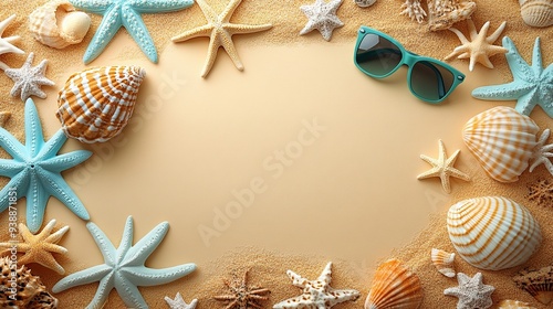 Beach sand toys and sunglasses on a pastel beige background for summer vacation.