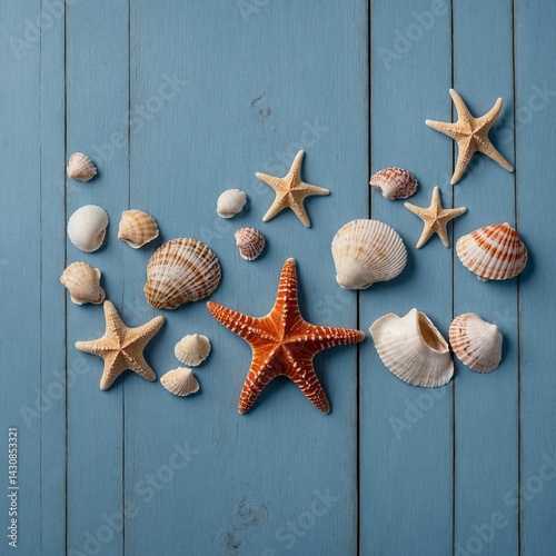Beach scene concept with seashells and starfish arranged aesthetically on a blue wooden surface, all set against a pure white background. The composition should be flat lay style, showcasing a top-dow