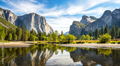 Beach scene with a flowing stream reflecting the surrounding peaks.