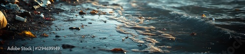 Beach Shoreline with Trash Piled Up in the Sand. Generative AI