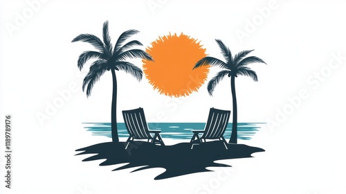 Beach sunset, chairs, palm trees, relaxation, tropical vacation