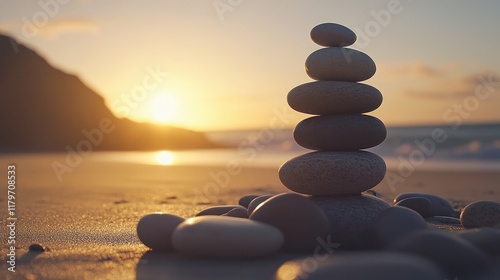 Beach sunset rocks balanced serenity meditation