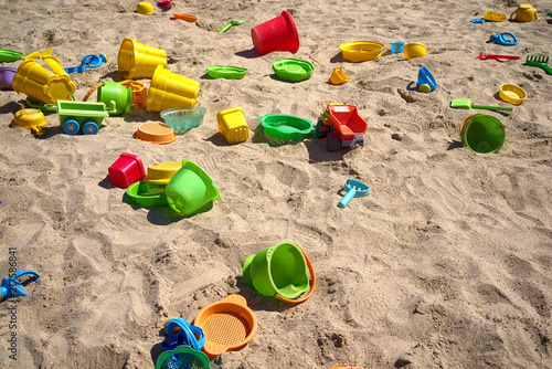Beach toys in the sand. Abandoned plastic toys in empty playground with no children.