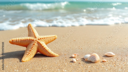 Beach with a starfish and seashells on the sand, ocean waves in the background