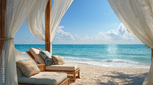 Beachside view of turquoise ocean waters framed by a draped cabana with lounge chairs