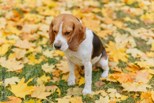 beagle dog in autumn forest. Puppy for a walk in leaf fall in woods