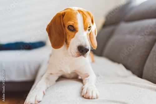 Beagle dog lying on sofa in cozy home. Bright interior