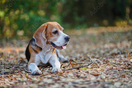 Beagle Dog Relaxing Outdoors in Autumn Nature with Fallen Leaves
