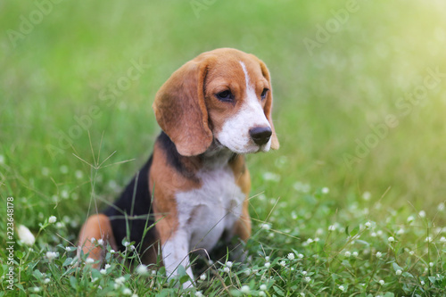 Beagle dog sitting on the wild flower field.