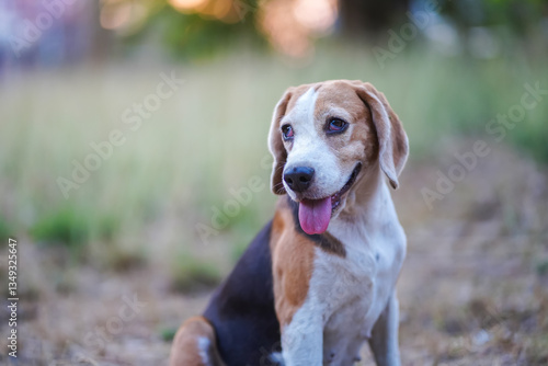 Beagle Dog Sitting Outdoors with Tongue Out at Sunset