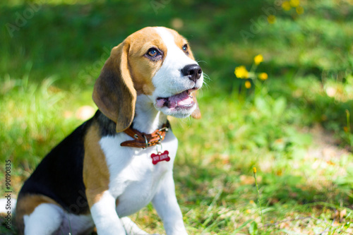 Beagle. Little puppy walks in the park.