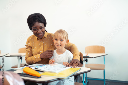 Beaming helpful teacher hugging cute blue-eyed smart girl