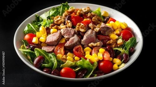 beans, corn, tomatoes, walnuts, and beef in a salad. Black background.