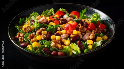 beans, corn, tomatoes, walnuts, and beef in a salad. Black background.