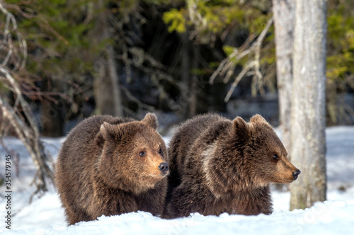 Bear cubs in winter forest. Natural habitat. Brown bear, Scientific name: Ursus Arctos Arctos.