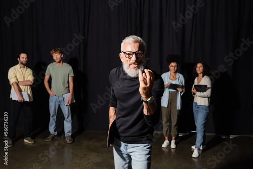 bearded art director in eyeglasses looking at camera and gesturing near multiracial students on blurred background.