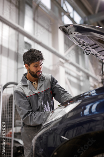 bearded auto mechanic engine performance in the hood of car, going to repair it, conducts diagnostics