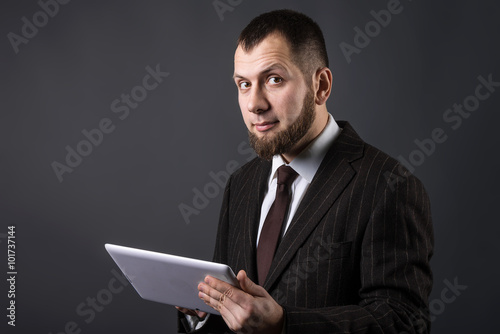 Bearded businessman with a tablet on grey background
