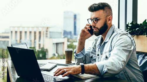 Bearded businessman,blogger sitting in cafe,talking on smart phone,working on laptop, freelancer working in coffee shop.
