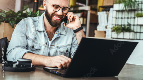 Bearded businessman,blogger sitting in cafe,talking on smart phone,working on laptop, freelancer working in coffee shop.