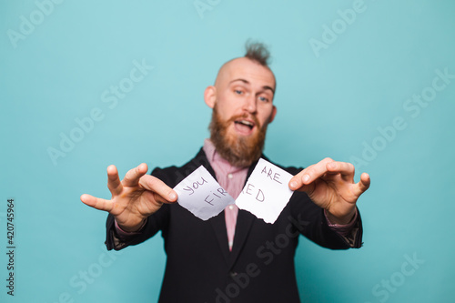 Bearded european businessman in dark suit isolated on turquoise background holding paper with you are fired tears up the paper with smile