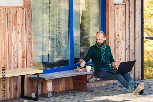 bearded freelancer works on laptop and talks on phone, sitting on steps of private house.
