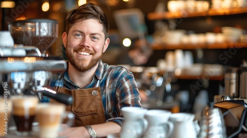 Bearded hipster barista wearing apron smiles at camera. Small business owner. Coffee shop.
