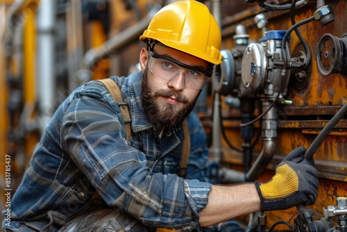 Bearded Industrial Worker Wearing Safety Glasses and Yellow Hard Hat Working on a Machine