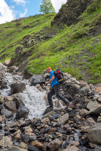 Bearded man adventurer with backpack is preparing to jump over a mountain river
