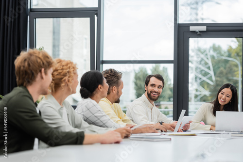 bearded man and asian woman smiling at interracial business colleagues in meeting room