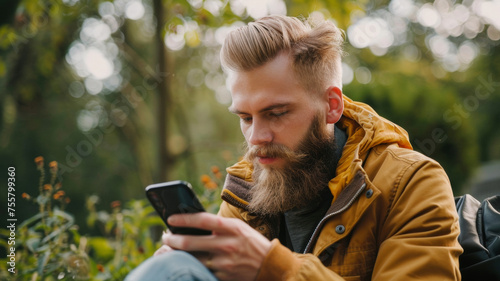 Bearded man focused on his smartphone amidst the vibrant autumn foliage outdoors.