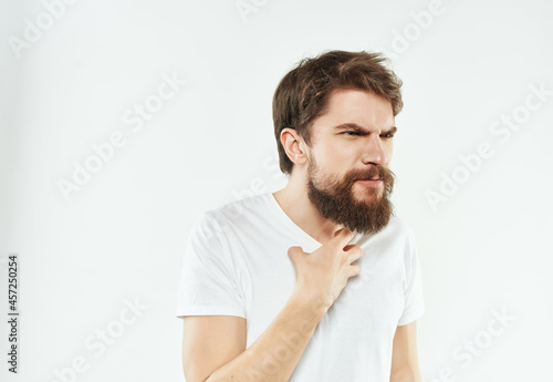 bearded man in a white t-shirt expressive look discontent close-up