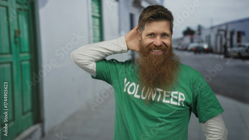 Bearded man wearing green volunteer shirt with hand behind head on street; charity support generosity.
