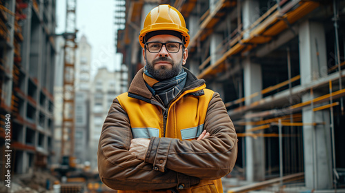 Bearded man wearing helmet and safety vest in work environment. Labor day and trades concept.