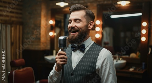 Bearded man wearing vest singing into vintage microphone in barbershop