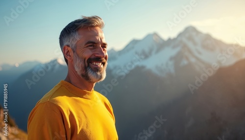 Bearded man with gray hair smiles wearing yellow sweater on mountain top. He enjoys sunny day outdoor with snowy peaks background. Active senior man, mountain hiker, enjoying scenic view.