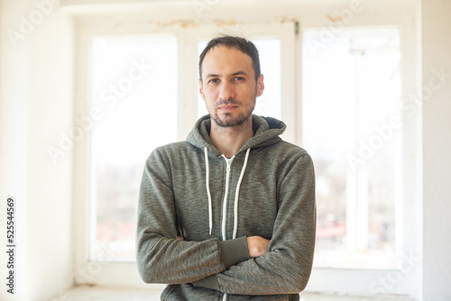 Bearded middle-aged man looking at camera with a serious expression in a close up head and shoulders portrait