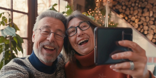 Bearded senior man hugging his cheerful wife and taking selfie on vacation.