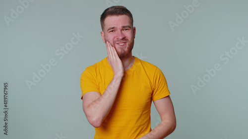 Bearded young man touching sore cheek suffering from toothache cavities or gingivitis waiting for dentist appointment, gums disease. Adult guy indoors studio shot isolated alone on gray background