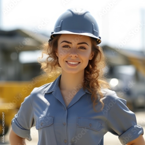 Beatiful confidence woman builder worker in uniform and safety helmet smilling. Labour day.
