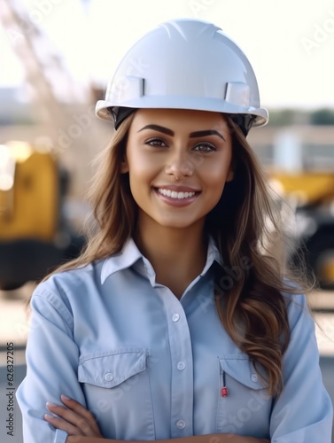 Beatiful confidence woman builder worker in uniform and safety helmet smilling. Labour day.