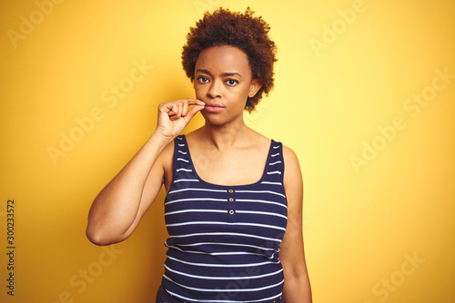 Beauitul african american woman wearing summer t-shirt over isolated yellow background mouth and lips shut as zip with fingers. Secret and silent, taboo talking