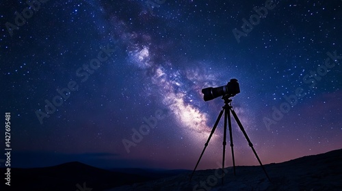 Beautfiul night landscape, silhouette of a camera on the tripod at the starry night and bright milky way galaxy.