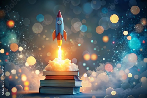 Beautiful abstract illustrations on a bokeh background, a toy rocket launches from the books and begins to spew smoke. Symbol of the thirst for knowledge and education