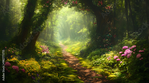 Beautiful abstract landscape with green grass and colorful flowers in spring